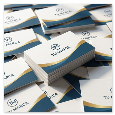 - Tarjetas: 90x50 mm o 85x55 mm. Papel 300–350 g. Terminaciones: laminado mate/brillo, canto pintado.